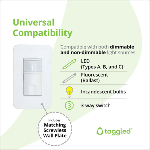 This motion sensor switch is everything as advertised. It can be used for a new installation or it can replace an existing switch. Fluorescent, incandescent, and LED bulbs can be used, so it is designed to be used in any setting. The switch has a manual setting with time delays of 3, 10, and 20 minutes as well as the choice of a vacancy and occupancy mode for maximum flexibility.